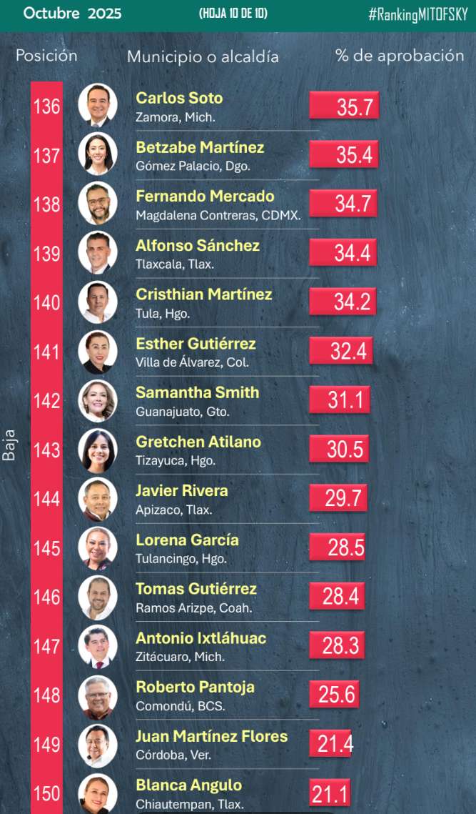 El ranking de aprobación del alcaldes de octubre de 2025 elaborado por Consulta Mitofsky reveló que los alcaldes de la entidad no cuentan con las mejores simpatías por parte de la ciudadanía, pues incluso 4 de ellos aparecen en los últimos puestos nacionales.