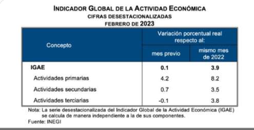En febrero de 2023 y a tasa mensual, el Indicador Global de la Actividad Económica (IGAE) creció 0.1 %, en términos reales.