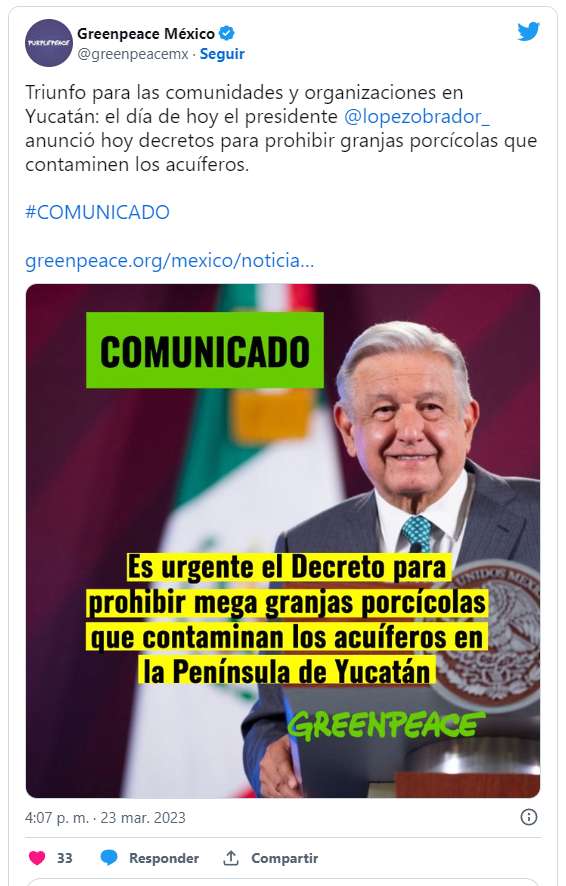 Greenpeace celebró que el presidente López Obrador señalase en su rueda de prensa matutina que emitirá un decreto para prohibir las granjas de cerdos que contaminan mantos acuíferos en la península de Yucatán.