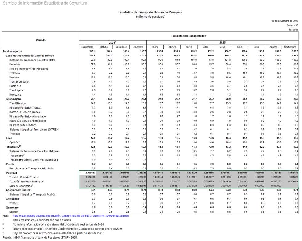 El número de usuarios que usó el Tuzobús durante septiembre fue de 63.8 mil diarios, siendo un alza respecto los 56.6 mil de agosto, aunque siguen siendo menos que los 70 mil registrados en septiembre de 2024, reveló el Instituto Nacional de Estadística y Geografía (Inegi).
