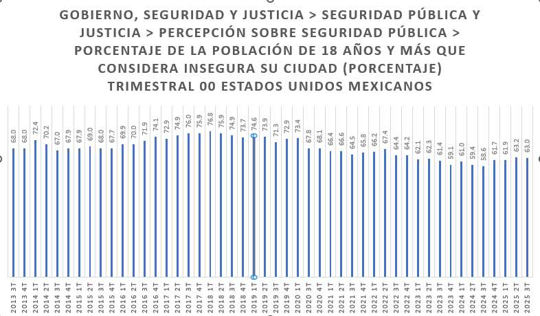La percepción de inseguridad en las ciudades del país ha venido a la baja de manera consistente desde la llegada de la 4T, toda vez que en 7 años, la cifra ha disminuido en casi 11 puntos porcentuales, reveló la Encuesta Nacional de Seguridad Pública Urbana (ENSU) del Inegi para el tercer trimestre de 2025.