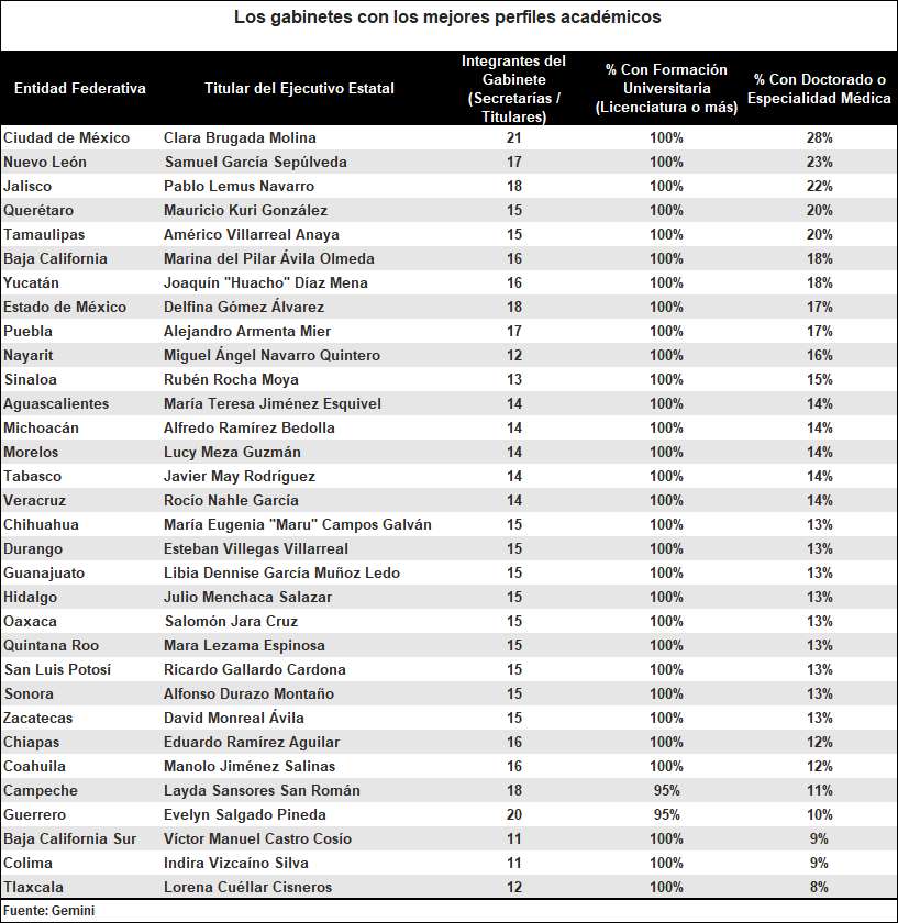 Las entidades más importantes del país son a su vez las que mayor cuidado reciben por parte de sus gobernantes para la designación de perfiles altamente académicos como titulares de sus secretarías dentro de sus gabinetes legales, condición por la que quienes encabezan dicho listado son la Ciudad de México, Nuevo León y Jalisco, en ese mismo orden.