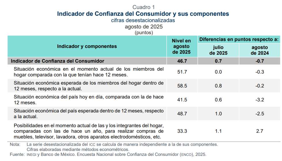 El Instituto Nacional de Estadística y Geografía (INEGI) reportó que la confianza del consumidor en México experimentó un incremento en agosto de 2025, aumentando 0.73 puntos hasta alcanzar 46.73 unidades, el nivel más alto desde diciembre de 2024.