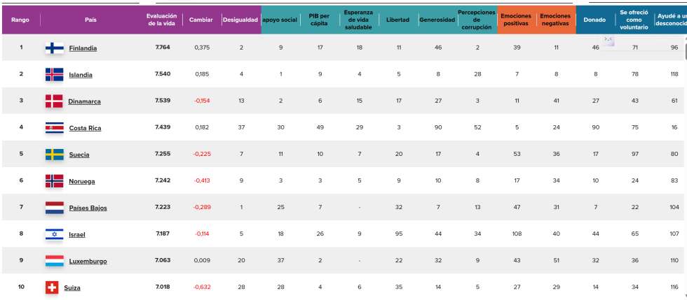 En el listado también destacan países europeos como Suecia, Noruega, Países Bajos y Suiza, así como Israel y Luxemburgo, todos con puntuaciones superiores a 7 puntos. Un caso relevante es Costa Rica, que alcanza el cuarto lugar con 7.439, posicionándose como el país latinoamericano mejor evaluado en términos de bienestar.