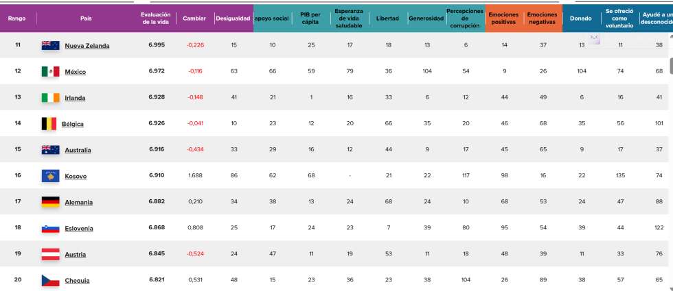 Por su parte, México se ubica en la posición 12, con una calificación de 6.972, lo que lo coloca cerca del top 10, mientras Estados Unidos y Canadá se encuentran 13 y 15 posiciones por debajo.