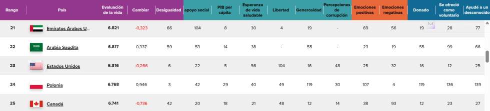 El estudio, respaldado por la ONU y elaborado por investigadores de la Universidad de Oxford, analiza 147 países. Para confeccionar la clasificación no se limita al PIB per cápita, sino que evalúa factores tangibles en la vida diaria: el apoyo social, la libertad para tomar decisiones, la esperanza de vida saludable y la percepción de corrupción entre los ciudadanos.
