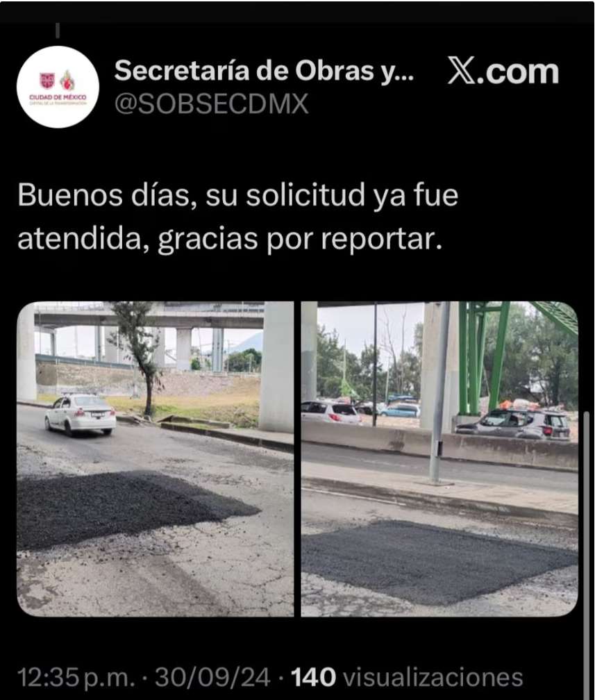 Se trataba de una denuncia ciudadana que la Secretaría de Obras y Servicios de la Ciudad de México atendió poco después, y fue notificada en redes sociales el 30 de septiembre de 2024.