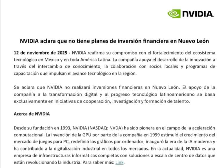 Además, aclaró que "Nvidia no realizará inversiones financieras en Nuevo León. Nuestro apoyo a la transformación digital y al progreso tecnológico en Latinoamérica se fundamenta exclusivamente en iniciativas de cooperación, investigación y desarrollo de talento".
