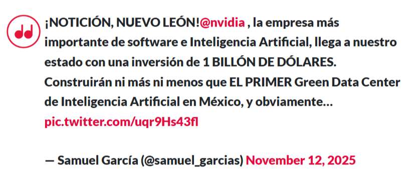 El mismo jueves por la mañana, Samuel García había compartido en sus redes sociales un "notición" para Nuevo León, anunciando que "Nvidia, la empresa más importante de software e Inteligencia Artificial, llegará a nuestro estado con una inversión de 1 BILLÓN DE DÓLARES. Construirán el PRIMER Green Data Center de Inteligencia Artificial en México, que, por supuesto, estará en Nuevo León".