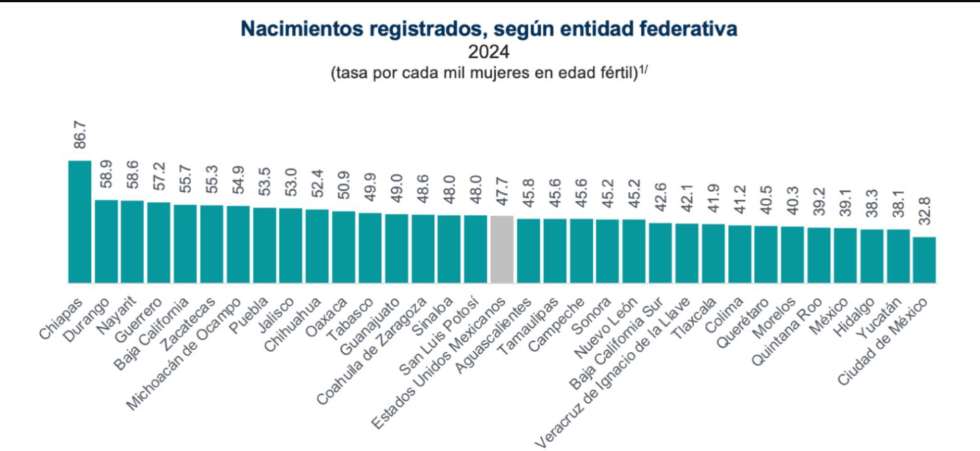 Entre las diferentes entidades federativas, Chiapas lidera la lista con la mayor tasa de nacimientos registrados en 2024, con 86.7 por cada mil mujeres en edad fértil, seguido de Durango con 58.9 y Nayarit con 58.6.