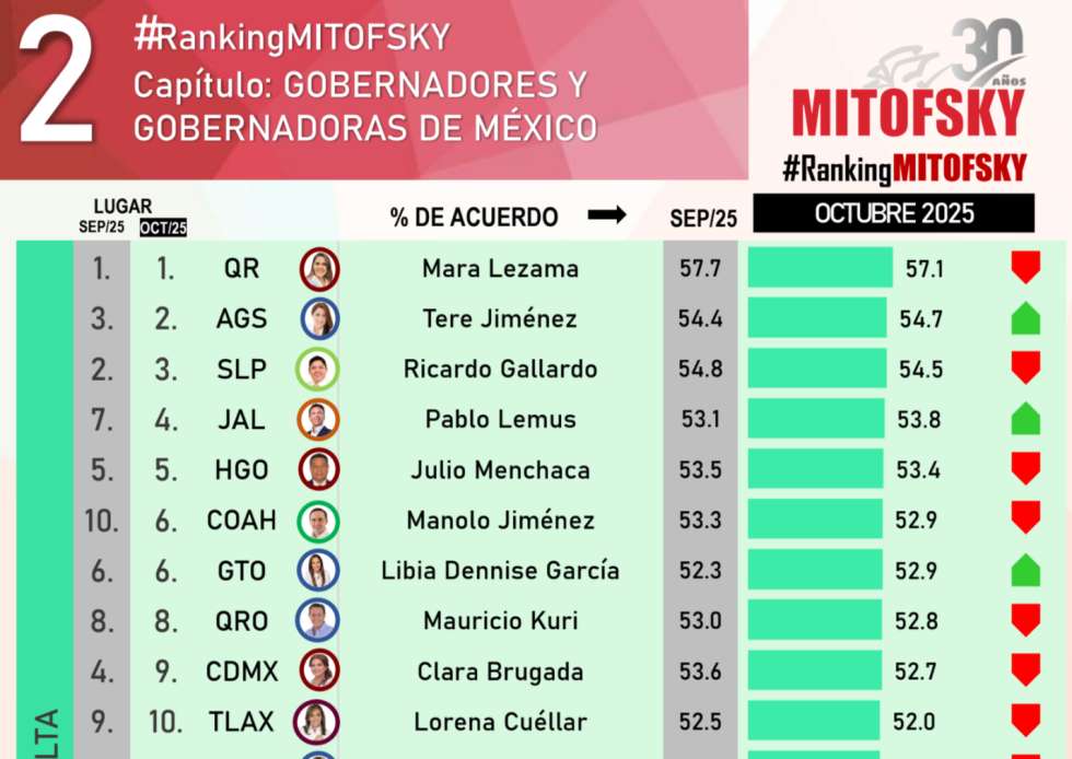 Mara Lezama, gobernadora de Quintana Roo, lidera el ranking con una aprobación del 57.1%, seguida por Tere Jiménez, gobernadora de Aguascalientes, con 54.4%. Le siguen Ricardo Gallardo Cardona (PVEM) de San Luis Potosí (54.5); Pablo Lemus Navarro (MC) de Jalisco (53.8).