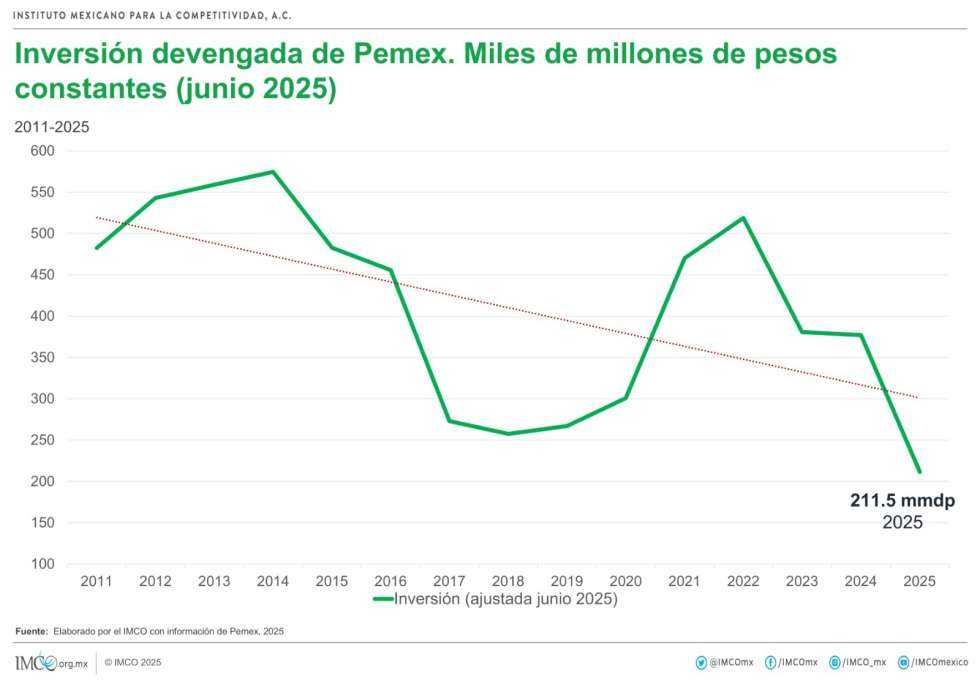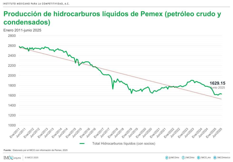 La producción actual de hidrocarburos líquidos de Pemex se ubicó en 1.6 millones de barriles diarios (MMbd), este es el menor monto desde la década de 1970. Únicamente entre enero y junio de 2025 la producción total de hidrocarburos líquidos cayó 9.9% comparado con el mismo periodo del año anterior.