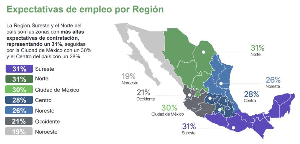 De acuerdo con la encuesta de expectativas de empleo para el cuarto trimestre de 2025, misma que es aplicada únicamente a empleadores, la zona centro del país, misma en la que se encuentra Hidalgo, tiene una expectativa de contratación laboral del 28%.