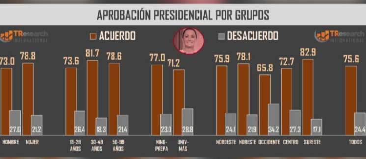 Si bien su aprobación se ha ido fortaleciendo, aún es la mitad de la que cuenta la presidenta de México, Claudia Sheinbaum, quien actualmente cuenta con el 75.6 % de aprobación al mes de enero del presente año, según resultados de una encuesta realizada por la agencia TResearch International.