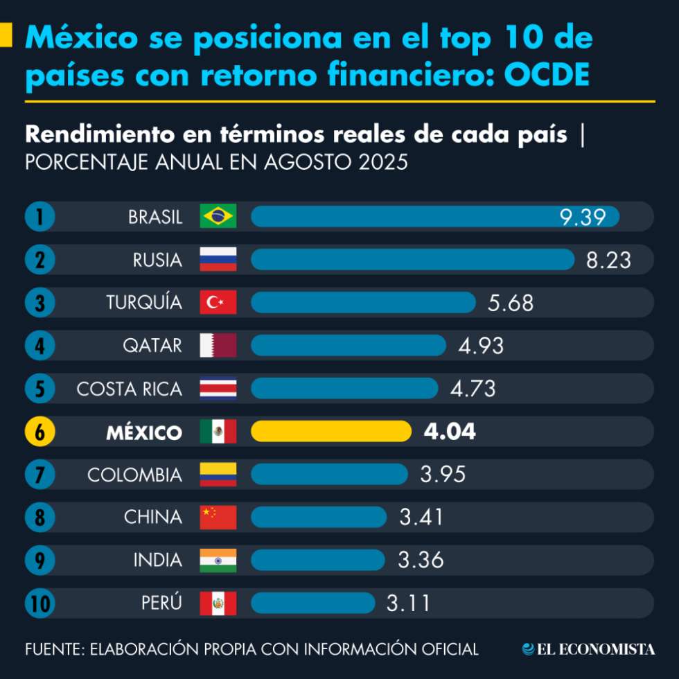 En el contexto de los ajustes en las tasas de referencia de los bancos centrales a nivel global, México se destacó por ofrecer altos premios a la inversión financiera. De acuerdo con datos de la OCDE (Organización para la Cooperación y el Desarrollo Económicos), la tasa de retorno financiero en términos reales en el país se situó en 4.04%.