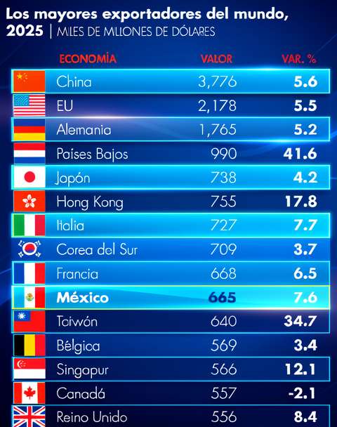 En la cima de la clasificación se encuentra China, con exportaciones de 3.6 billones de dólares y un crecimiento del 5.6%. Le siguen Estados Unidos con 2.1 billones (5.5% de crecimiento) y Alemania con 1.7 billones (5.2%). Las siguientes posiciones son ocupadas por Japón, Hong Kong, Italia y Corea del Sur.