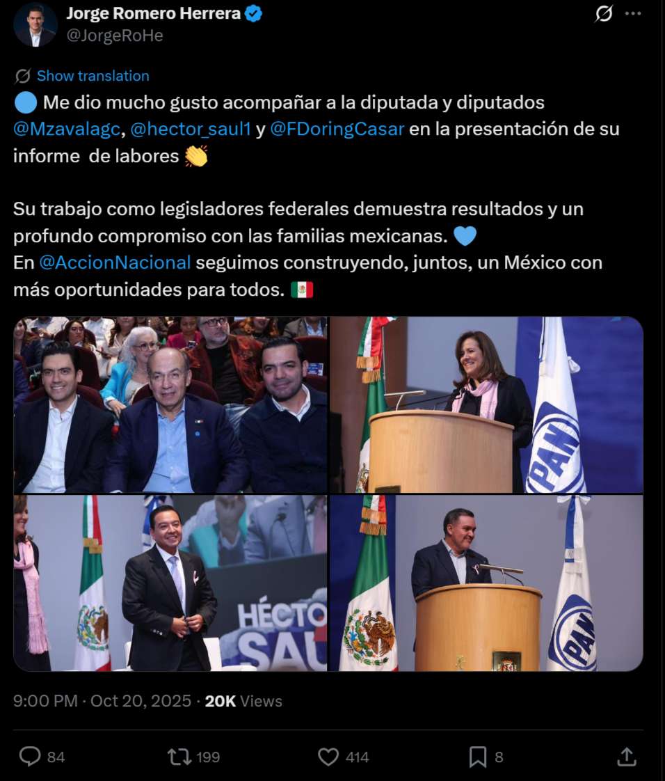 El expresidente Felipe Calderón Hinojosa (FCH) fue visto hoy junto al líder del Partido Acción Nacional (PAN), Jorge Romero Herrera, durante un informe de labores presentado por varios diputados del blanquiazul, entre ellos Margarita Zavala, esposa del exmandatario, quien manifestó su interés por regresar a la política en una entrevista.