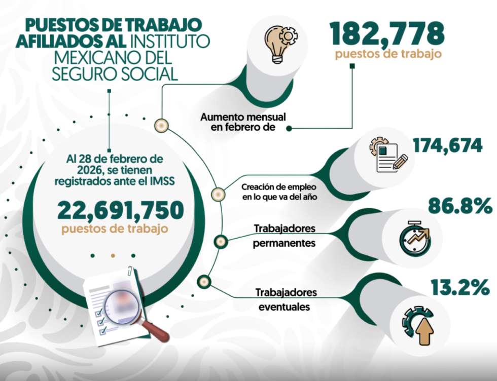 El IMSS reportó la creación de 182,778 empleos formales en febrero, después de la pérdida de 8,104 puestos en enero. Con estos datos, el total de empleos formales en México se eleva a 22,691,750, lo que representa un avance mensual del 0.8% y el mismo porcentaje en comparación anual.
