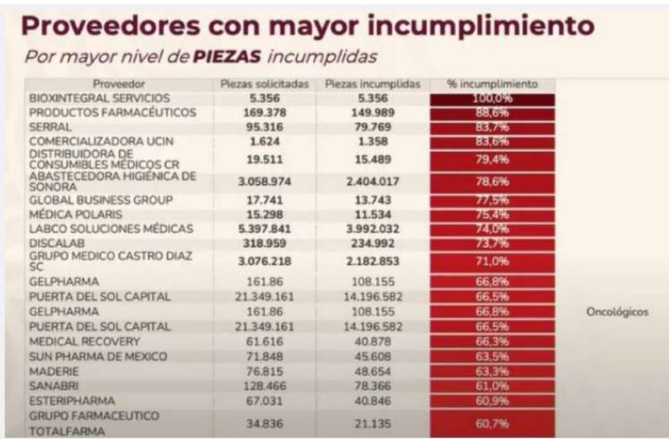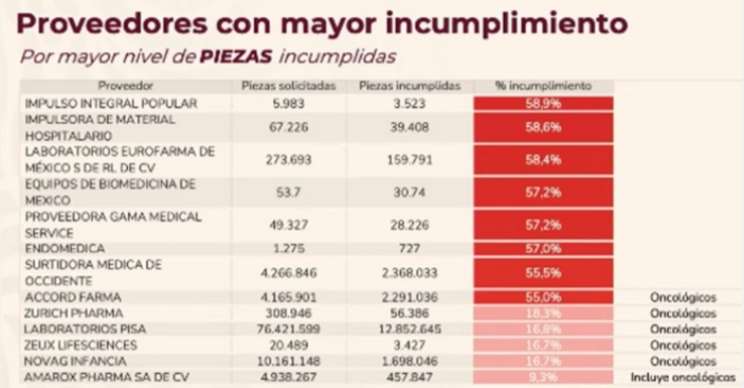 El Gobierno de México reveló este martes una gran cantidad de empresas farmacéuticas que han incumplido con la entrega de medicamentos e insumos médicos en hospitales y clínicas del país, afectando la disponibilidad de fármacos tanto comunes como oncológicos.