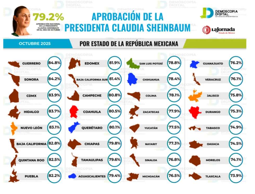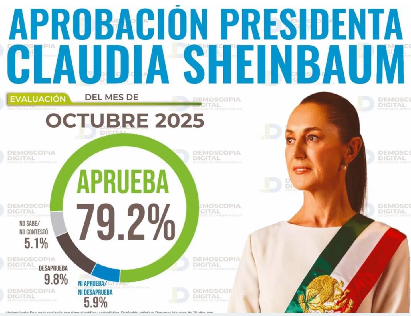 La presidenta Claudia Sheinbaum cerró octubre con una aprobación de 79.2% según la más reciente encuesta de Demoscopia Digital, una cifra que la mantiene en la cima del panorama político nacional. El respaldo ciudadano, que se ha sostenido a lo largo de su primer año de gobierno, refleja —más allá de los números— una conexión directa con la gente, sobre todo en momentos de emergencia.