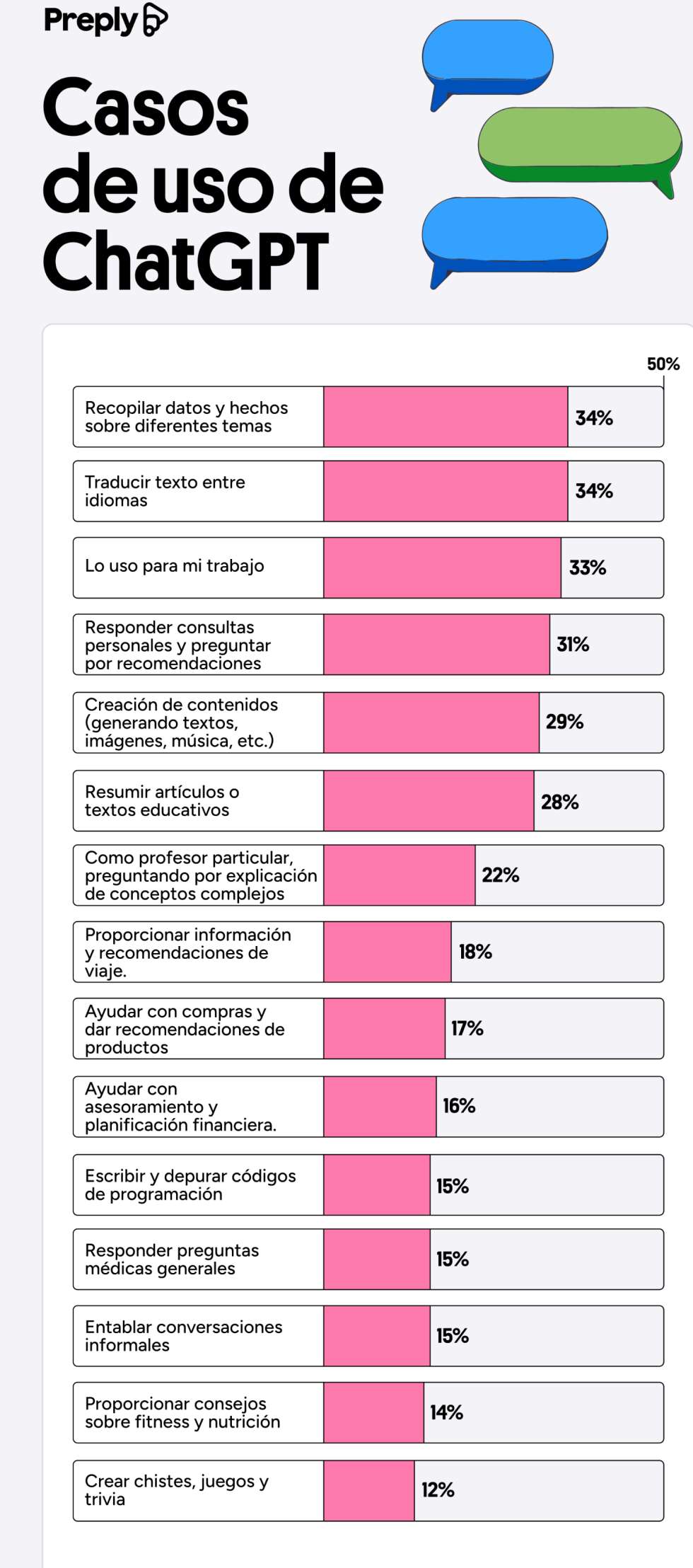 A nivel mundial las razones para usar ChatGPT son muy variadas de acuerdo a las respuestas de este estudio, desde la mera recopilación de datos (34 %), la traducción (34 %), el uso para trabajar (33 %), las preguntas personales y recomendaciones (31 %) a la generación de contenidos de texto o imágenes (29 %).