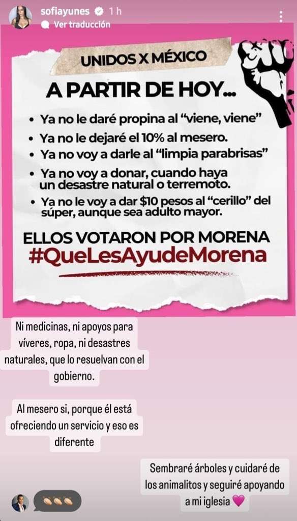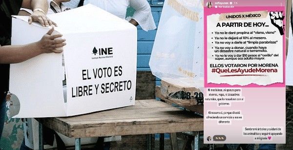 Esas acciones serían en represalia porque tales grupos habrían votado por Morena, por lo que incluso remarcan que sea ese partido sea el encargado de brindarles propinas. ’Ellos votaron por Morena. Que les ayude Morena’, se agrega en el mensaje, que han compartido simpatizantes del frente opositor, entre ellos, Sofía Yunes, excandidata a diputada local en Veracruz y sobrina del exgobernador veracruzano Miguel Ángel Yunes Linares.