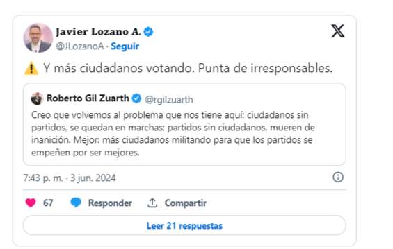 Otro que arremetió contra el electorado fue Javier Lozano Alarcón, exsecretario del Trabajo con Felipe Calderón, quien calificó como “punta de irresponsables” a quienes ejercieron su voto a favor de Sheinbaum.