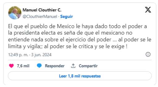 Manuel Clouthier, también del PAN, señaló a su vez: “El que el pueblo de México le haya dado todo el poder a la presidenta electa es señal de que el mexicano no entiende nada sobre el ejercicio del poder… al poder se le limita y vigila; al poder se le critica y se le exige! (sic)”.SIN EMBARGO