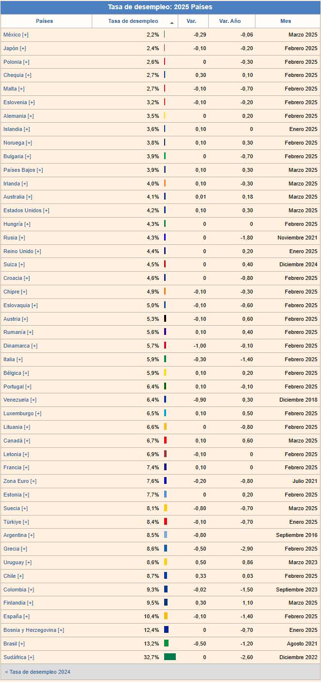 La Tasa de Desempleo en México para el mes de marzo se ubicó en el 2.2% de acuerdo con el Instituto Nacional de Estadística y Geografía (Inegi), por lo que Expansión ubicó al país como aquel con la TDA más baja del mundo entre las principales economías.