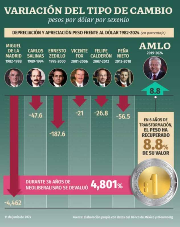 Durante 36 años de gobiernos neoliberales el peso se devaluó 4,801% frente al dólar; de 2019 al 2024, la moneda mexicana ha recuperado 8.8% de su valor y es una de las divisas más apreciadas a nivel mundial, de acuerdo con datos del Banco de México.
