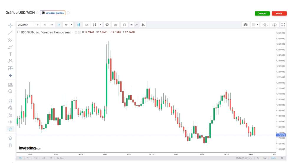 Los especialistas prevén que el tipo de cambio promedio se mantenga en aproximadamente 17.60 pesos por dólar para el primer trimestre de 2026, con expectativas de que se mantenga en niveles competitivos.